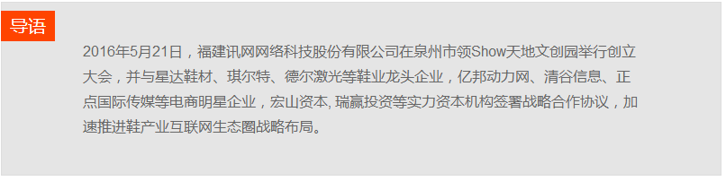 2016年5月21日,福建訊網(wǎng)網(wǎng)絡(luò)科技股份有限公司在泉州市領(lǐng)Show天地文創(chuàng)園舉行創(chuàng)立大會,并與星達鞋材、琪爾特、德爾激光等鞋業(yè)龍頭企業(yè),億邦動力網(wǎng)、清谷信息、正點國際傳媒等電商明星企業(yè),宏山資本, 瑞贏投資等實力資本機構(gòu)簽署戰(zhàn)略合作協(xié)議,加速推進鞋產(chǎn)業(yè)互聯(lián)網(wǎng)生態(tài)圈戰(zhàn)略布局。
