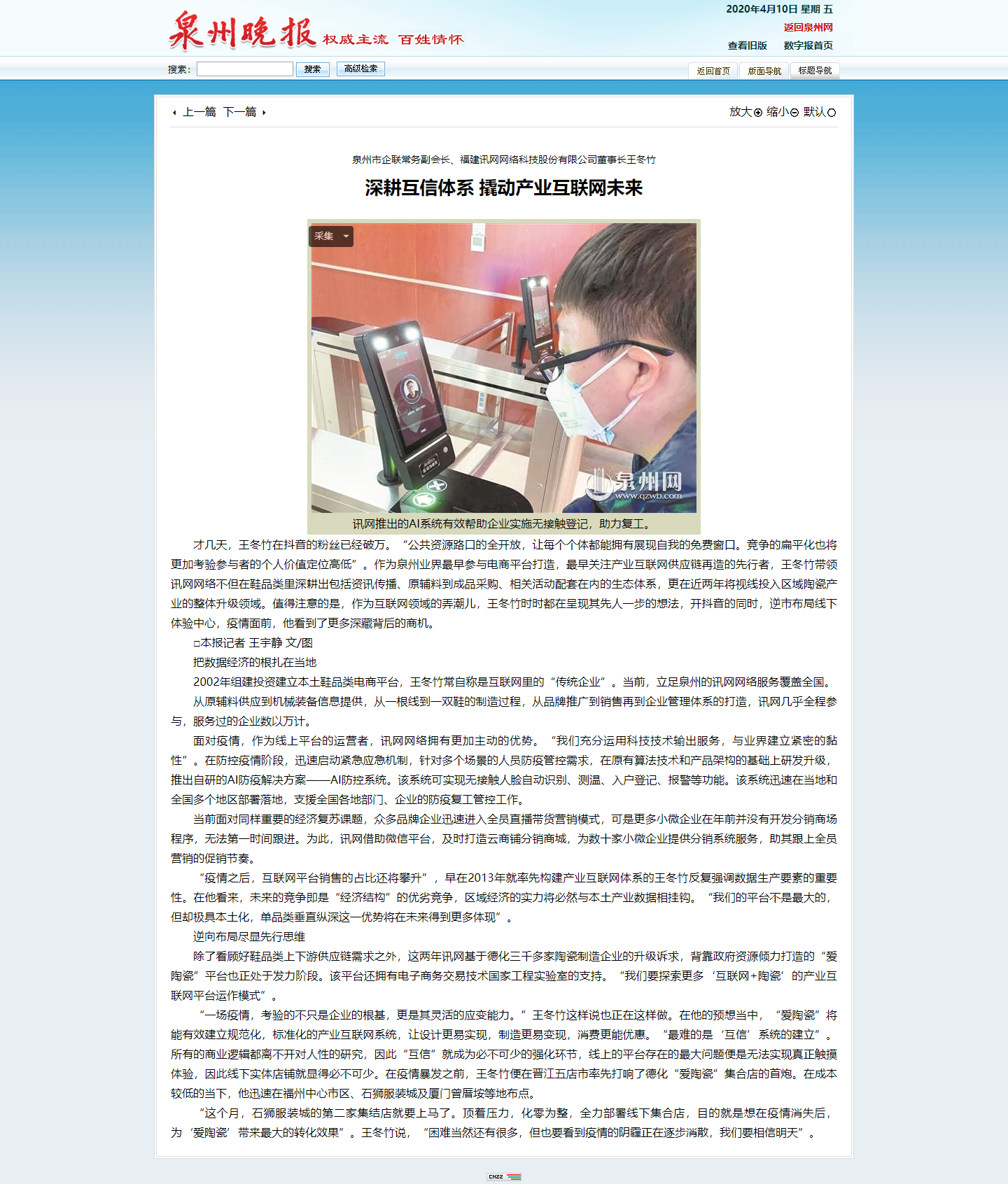 才幾天,王冬竹在抖音的粉絲已經(jīng)破萬。“公共資源路口的全開放,讓每個(gè)個(gè)體都能擁有展現(xiàn)自我的免費(fèi)窗口。競爭的扁平化也將更加考驗(yàn)參與者的個(gè)人價(jià)值定位高低”。作為泉州業(yè)界最早參與電商平臺打造,最早關(guān)注產(chǎn)業(yè)互聯(lián)網(wǎng)供應(yīng)鏈再造的先行者,王冬竹帶領(lǐng)訊網(wǎng)網(wǎng)絡(luò)不但在鞋品類里深耕出包括資訊傳播、原輔料到成品采購、相關(guān)活動配套在內(nèi)的生態(tài)體系,更在近兩年將視線投入?yún)^(qū)域陶瓷產(chǎn)業(yè)的整體升級領(lǐng)域。值得注意的是,作為互聯(lián)網(wǎng)領(lǐng)域的弄潮兒,王冬竹時(shí)時(shí)都在呈現(xiàn)其先人一步的想法,開抖音的同時(shí),逆市布局線下體驗(yàn)中心,疫情面前,他看到了更多深藏背后的商機(jī)。