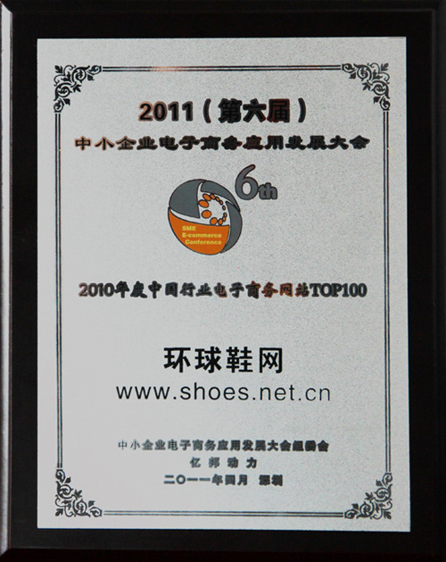 2011年4月21-23日,由億邦動力網、深圳市信息行業協會聯合主辦的“戴爾成就•2011(第六屆)中小企業電子商務應用發展大會暨2010年度中國行業電子商務網站TOP100頒獎盛典”在深圳五洲賓館隆重舉行。環球鞋網應邀出席典禮,并榮獲“2010年度中國行業電子商務網站TOP100”稱號。據悉,這是環球鞋網第六次榮獲“中國行業電子商務網站TOP100”。